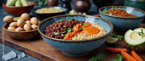 © SlavaOkey, Fototapeta premium Colorful bowls of traditional ingredients and flavors