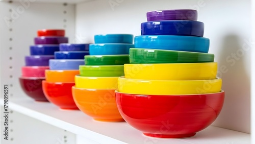 Naklejka premium Colorful bowls stacked on shelf bright kitchenware home goods rainbow dishes...
