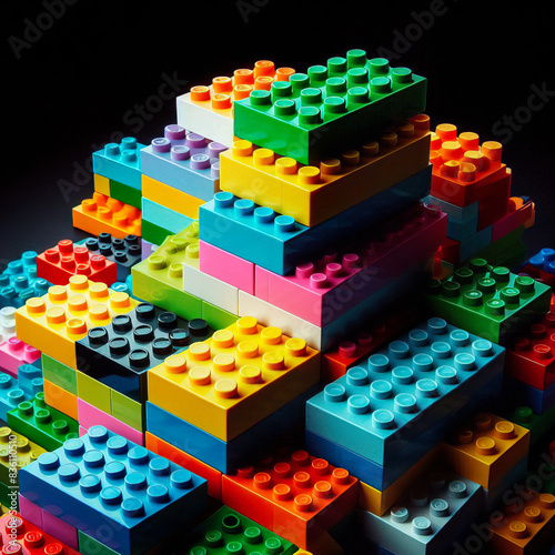 © Artvi, Fototapeta premium Colorful bricks stacked on black background closeup