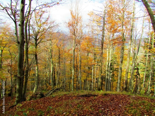 Fototapeta premium Colorful bright yellow and orange beech (Fagus sylvatica) forest in autumn in Slovenia