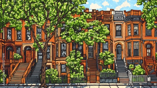 © NusratJahan, Fototapeta premium Colorful brownstone buildings in NYC with cinematic natural lighting