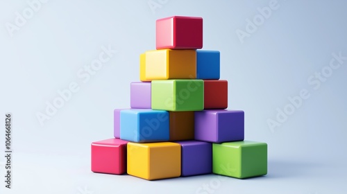 © fotofabrika, Obraz premium Colorful building blocks arranged in a pyramid shape on a light blue background, showcasing creativity and playfulness