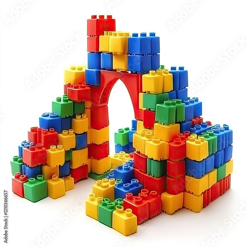 © DZIKRA , Fototapeta premium Colorful building blocks castle, child's play, white background, educational toy