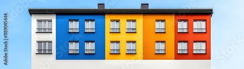 Fototapeta premium Colorful Building Facade with Windows in Blue, Yellow, Red, and White against a Clear Sky