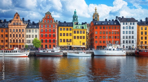 © AriyaniAI, Naklejka premium Colorful Buildings and Boats on a Sunny Day in Stockholm