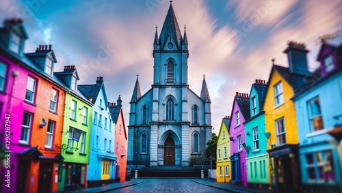 © fotofabrika, Fototapeta premium Colorful buildings frame historic church in vibrant town during twilight hours