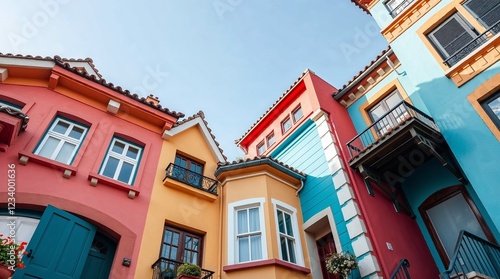 © Anastasiya, Fototapeta premium Colorful buildings in a vibrant urban setting under a clear blue sky