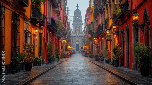 Fototapeta premium Colorful buildings line a cobblestone street leading to a church