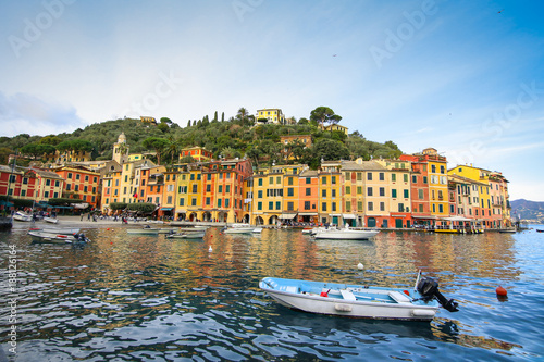 Naklejka premium Colorful buildings on the promenade of Portofino with boats floating in the...