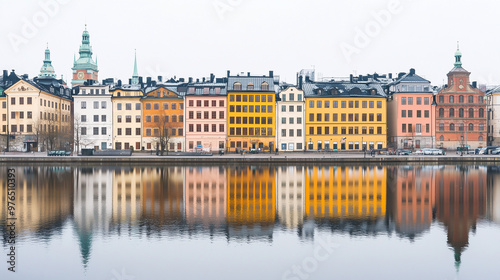 Naklejka premium Colorful buildings reflecting in a calm river under an overcast sky,...
