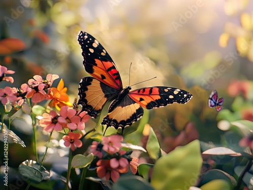 Naklejka premium Colorful Butterflies Dancing Among Delicate Flowers in a Warm Sunny Garden