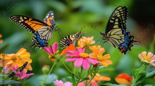 Fototapeta premium Colorful Butterflies Gathering on Vibrant Flowers in a Garden Setting