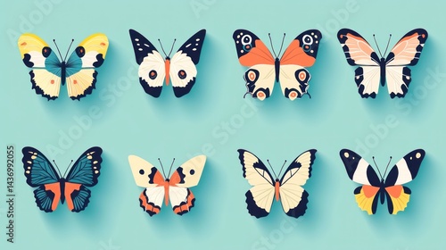 © joo, Fototapeta premium Colorful butterflies on blue background, nature design, graphic