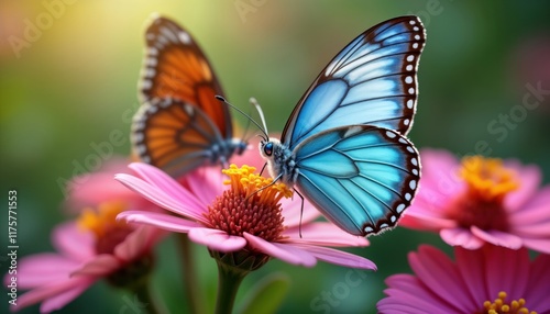 Fototapeta premium Colorful butterflies rest on pink flowers. Close up view of beautiful insects...