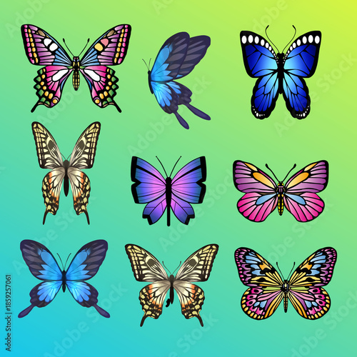 © dev, Fototapeta premium Colorful Butterfly Illustration Set on Green Gradient Background