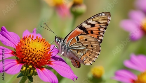 Obraz premium Colorful butterfly perched on a vibrant pink flower in nature.
