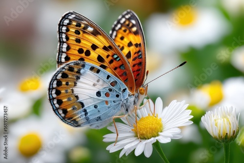 © YouraPechkin, Obraz premium Colorful butterfly resting on a daisy in a vibrant garden during springtime