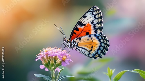 © HPMP Studio, Naklejka premium Colorful Butterfly Resting on Flower with Detailed Wing Markings