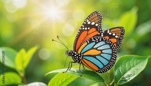 Fototapeta premium Colorful butterfly resting on green leaf in bright sunlight