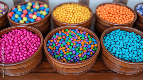 Fototapeta premium Colorful candy buffet top view, mixed round candies in wooden bowls, vibrant textures and cheerful party atmosphere