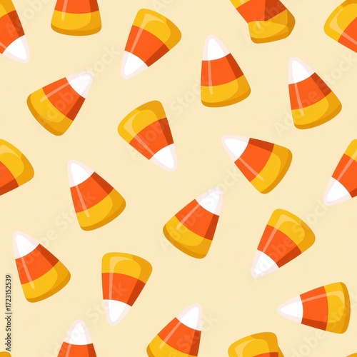 © Kin no Hikari, Fototapeta premium Colorful candy corn pattern on a soft beige background for festive occasions.