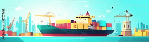 Obraz premium Colorful cargo ship loading containers in a bustling port, showcasing...