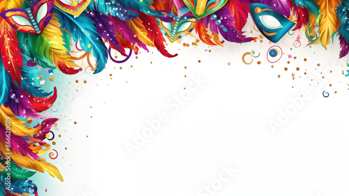 © Mala, Fototapeta premium Colorful Carnival Feather Mask Border with Confetti on White Background for Festive Celebrations and Events