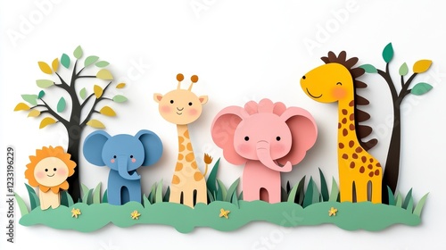 Naklejka premium Colorful Cartoon Animal Decor with Trees and Green Grass for Kids