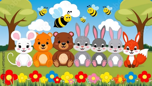 © Get it, Naklejka premium Colorful cartoon animals sitting in a vibrant meadow with flowers and trees, perfect for children's illustrations, posters, or greeting cards. Ideal for cheerful designs.
