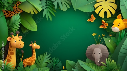 © Nhoeb, Fototapeta premium Colorful Cartoon Animals Surrounded by Lush Tropical Foliage