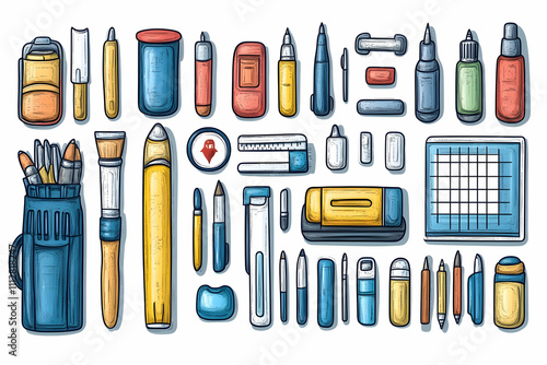 Obraz premium Colorful cartoon art supplies collection including pencils, pens, brushes,...