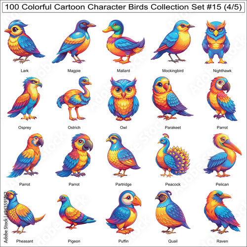 © MARWA BELAL, Obraz premium Colorful Cartoon Character Birds Collection Set of 100 Isolated Animals Part 4