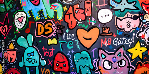 Obraz premium Colorful Cartoon Characters and Abstract Shapes on Dark Background