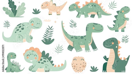 Obraz premium Colorful Cartoon Dinosaur Animals with Tropical Foliage Background