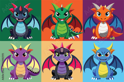 © Nazrul Kabir, Naklejka premium Colorful Cartoon Dragon Collection with Wings Horns and Scales on a Background