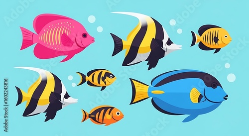 Naklejka premium Colorful cartoon fish of various species swimming in a light blue aquatic environment.