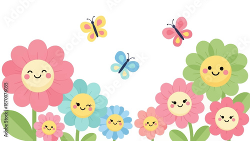 Fototapeta premium Colorful Cartoon Flowers with Smiling Faces and Butterflies.