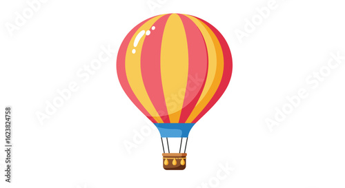 © AI_ID, Naklejka premium Colorful cartoon hot air balloon with red and yellow stripes. Isolated vector graphic for concepts of travel, flight, and adventure.