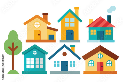 © Design Adelsa, Fototapeta premium Colorful Cartoon Houses with a Tree and Smoke
