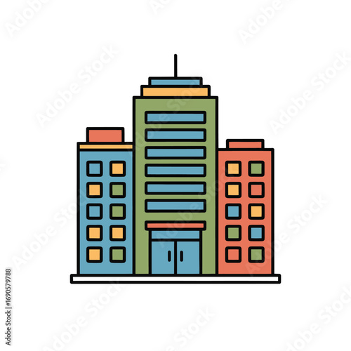Obraz premium Colorful cartoon illustration of modern office buildings on white background architecture