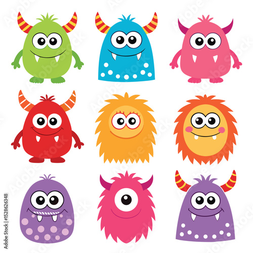 © Silhouette boss 7067, Fototapeta premium Colorful cartoon monsters collection with big eyes and horns on a white background