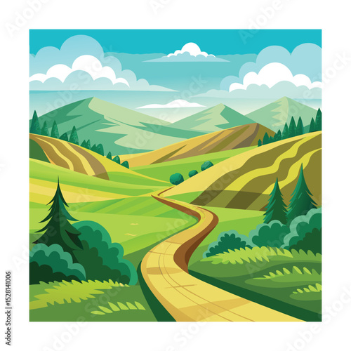 Obraz premium "Colorful Cartoon Mountain Landscape with Winding Path and Rolling Hills"