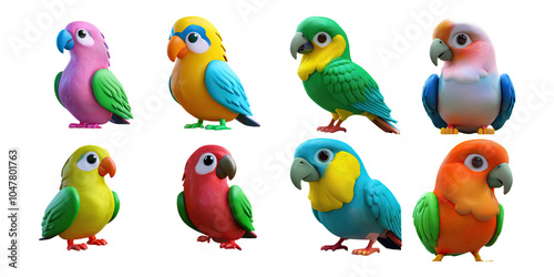 © Jieee Mooo, Obraz premium Colorful Cartoon Parrots in Various Poses, PNG collection, set bundle, isolate on transparent or white background