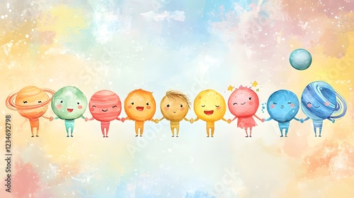 Naklejka premium Colorful Cartoon Planets Holding Hands in a Joyful Display
