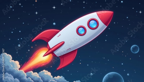 © BEN, Naklejka premium Colorful Cartoon Rocket Launching into Space with Flames Against a Starry Night Sky