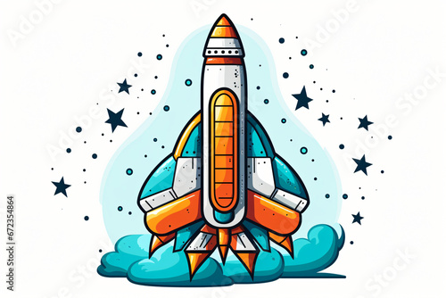 Fototapeta premium Colorful cartoon rocket with clouds and stars