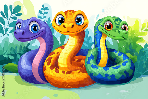 © Noufaldi, Obraz premium Colorful cartoon snakes with expressive eyes in a vibrant, playful setting.