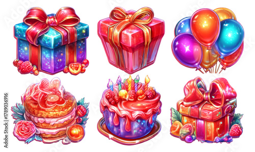 Fototapeta premium Colorful Celebration Illustrations of Gifts, Cake, and Balloons on Transparent Background