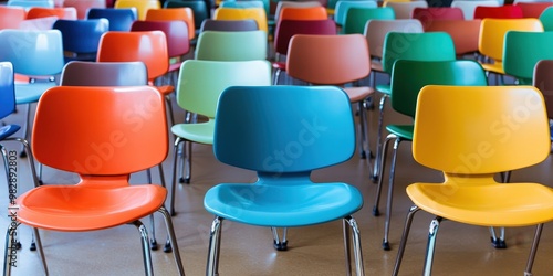 Naklejka premium Colorful Chairs in a Modern Classroom Setting