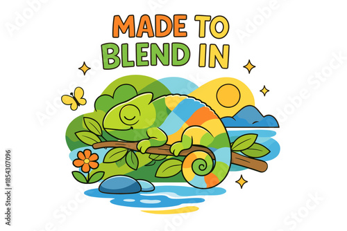 © 4zevar, Obraz premium Colorful chameleon on branch with nature elements and blending message